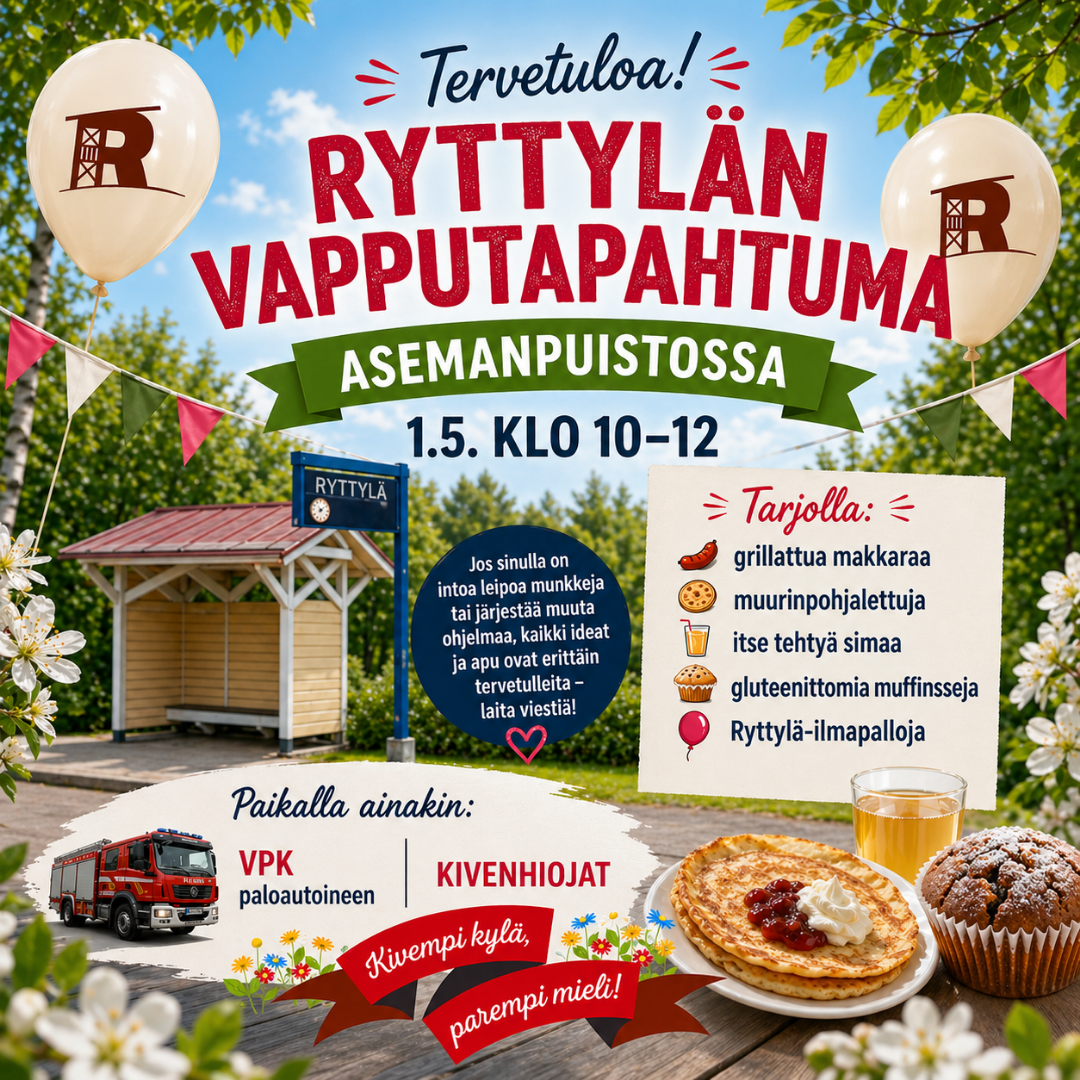 Tervetuloa Ryttylän kyläyhdistyksen sääntömääräiseen vuosikokoukseen Ryttylän kyläyhdistys ry:n sääntömääräinen vuosikokous pidettiin lauantaina 14.3.2026 klo 14 Ryttylässä Punka Hubissa, Vanha…